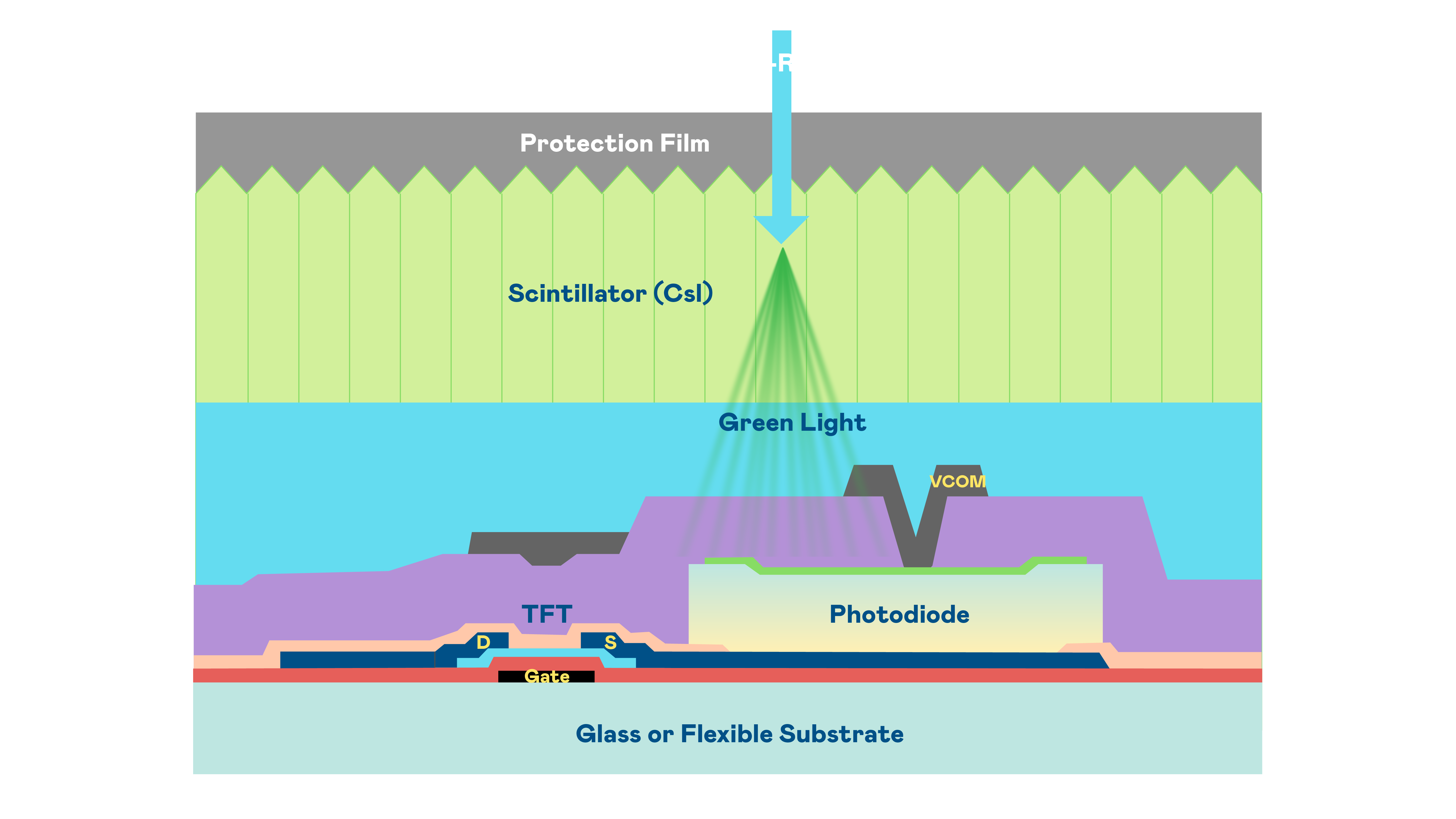 ag博天堂的X光影像感测阵列使用薄膜电晶体 (TFT) 作为每个像素的读取开关,搭配光电二极体(Photodiode)的光电转换元件,用以感测X光影像讯号。
